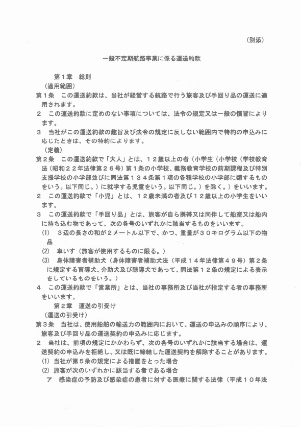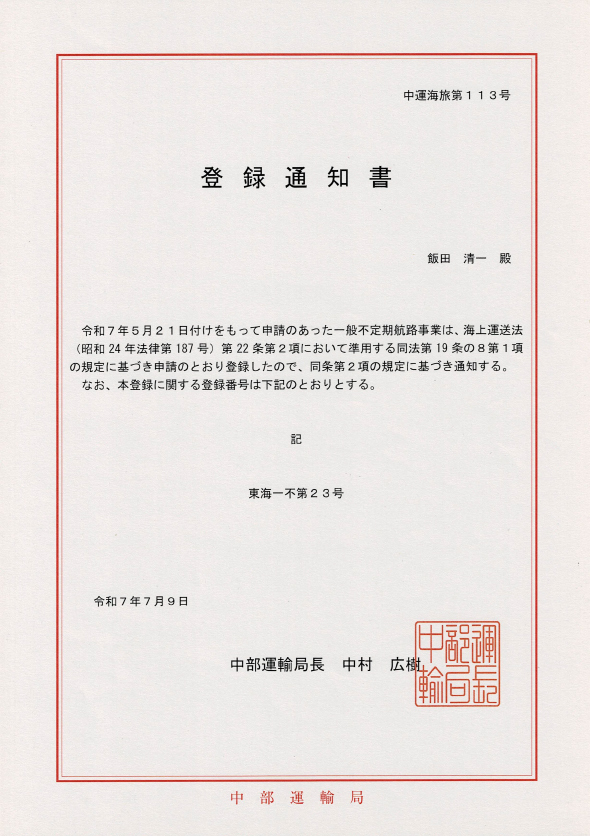 船舶について 全長11メートル全幅2.6メートル2.9トン最大搭載人員15名(内船員3) その他設備 GPSプロッター レーダー 個室トイレ ドリンクホルダー多数 USB付ラジオ 自動膨張式ライフジャケット お子様用ライフジャケット(各サイズご用意しております) その他法廷備品一式 一般不定期航路 登録通知書 内航一般不定期航路事業 国土交通省 中部運輸局 中運海旅第113号 東海一不第23号 安全統括管理者1名 運行管理者3名